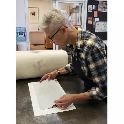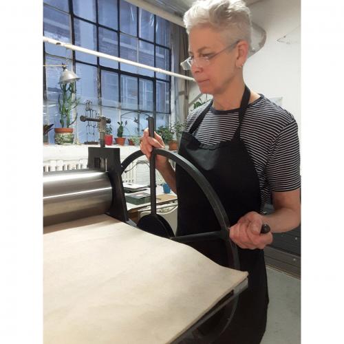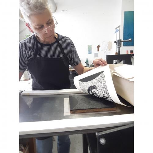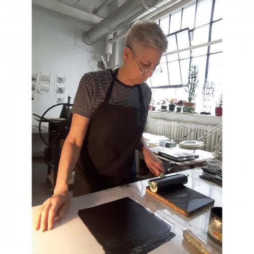 Pamela Dodds’ artwork in printmaking, painting and drawing is exhibited regularly in Canada, the USA and Europe. In suites of linocut prints in graphic black-and-white, Dodds employs the language of the gesture of the human form in imagery of paired female and gender ambiguous figures, to explore the ebb and flow of intimate relationships. In Memory’s Witness, a suite of 6 woodcut prints, in which the symmetrical filigree patterns of woodgrain evoke atmosphere and sound, she addresses the cyclical nature and generational trauma of war, as witnessed by a mythic and timeless pair of women, girls, crones. Also, in small paintings and drawings, Dodds explores the resonance and embedded history within ordinary objects and the natural world. "Printmaker Pamela Dodds employs a bold linearity...to create a world of deeply human and healing interaction..." stated arts writer R.M. Vaughan in The Globe and Mail. Collectors include Purdue University, Illinois, Capital One Bank, Ontario, Boston Public Library, Massachusetts and Cleveland Museum of Art, Ohio. Supporters include the Toronto Arts Council, Ontario Arts Council, Canada Council for the Arts, and Barbara Deming Fund for feminist art. She lives and works in Toronto.